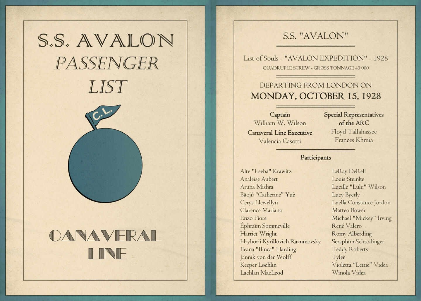 The Avalon Expedition is a high-profile collaborative venture between the ARC and the Canaveral Line. Some see it as a novelty initiative comparable to the World’s Fair, while others see it as a golden opportunity to champion international scientific cooperation and discovery. Ultimately, it can be assumed that there are a wide number of different motivations at play, each of which may vary dramatically depending on who you ask.The Expedition will begin by sailing from London (by way of Tilbury), and is chartered to visit several ports in Europe before undergoing a transatlantic crossing to New York- all in search of catalytic materials and any "anomalies" deriving therefrom. Along the way, the Expedition will carry a number of high-profile clientele, passengers, and crew. Such names include...